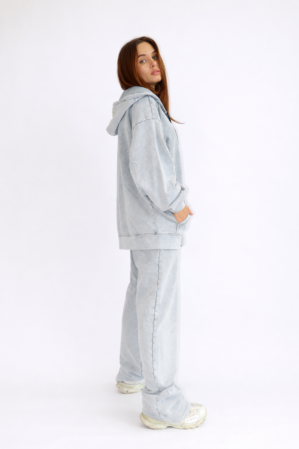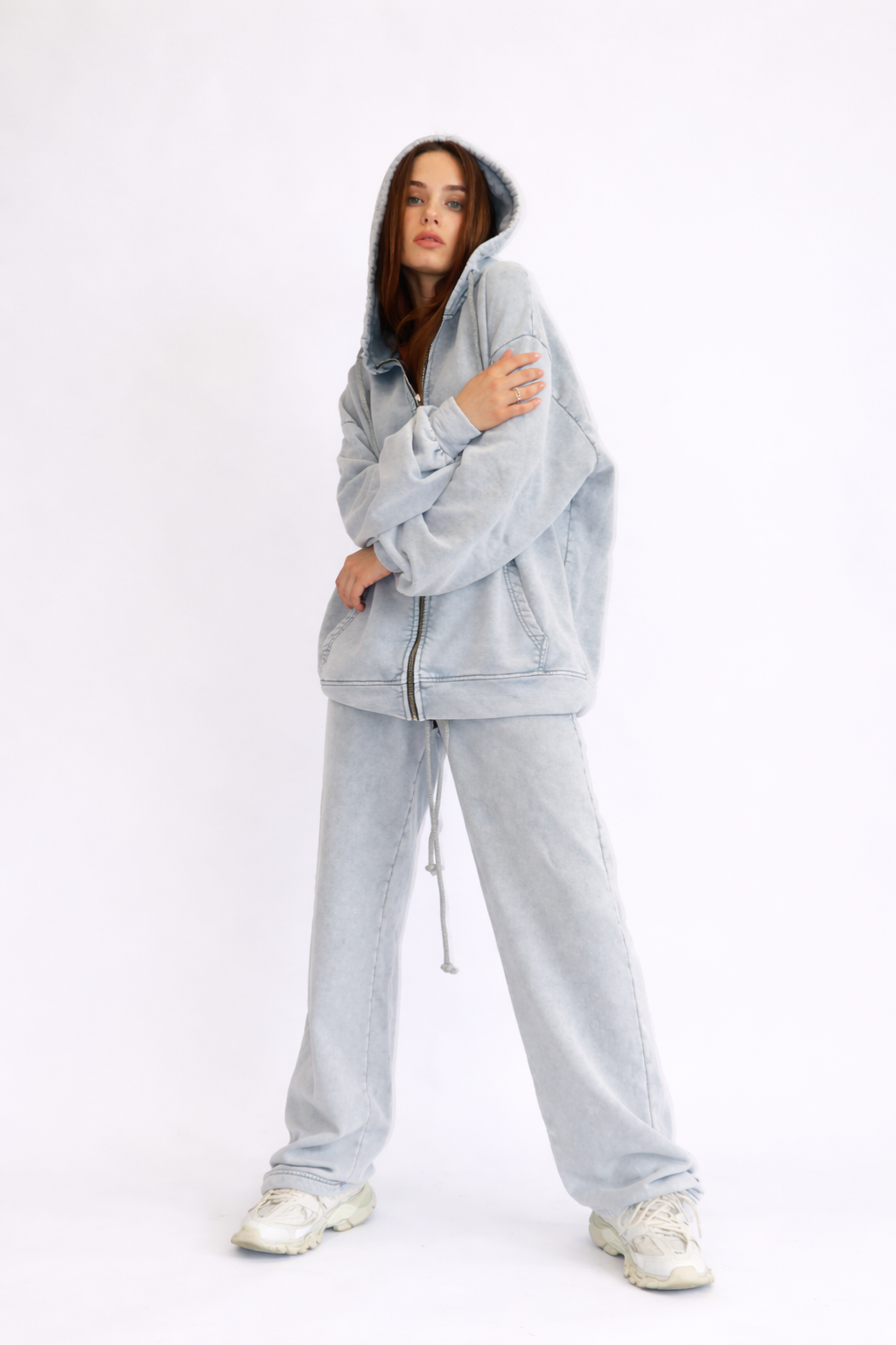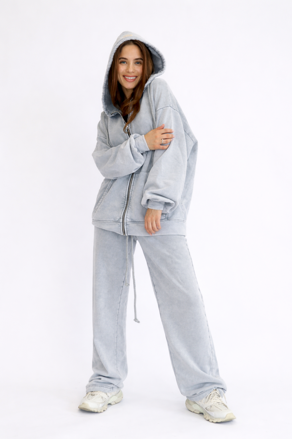 Dresowy komplet oversize dwuczęściowy – bluza na suwak + spodnie z wysokim stanem i podwójną gumą w talii.
