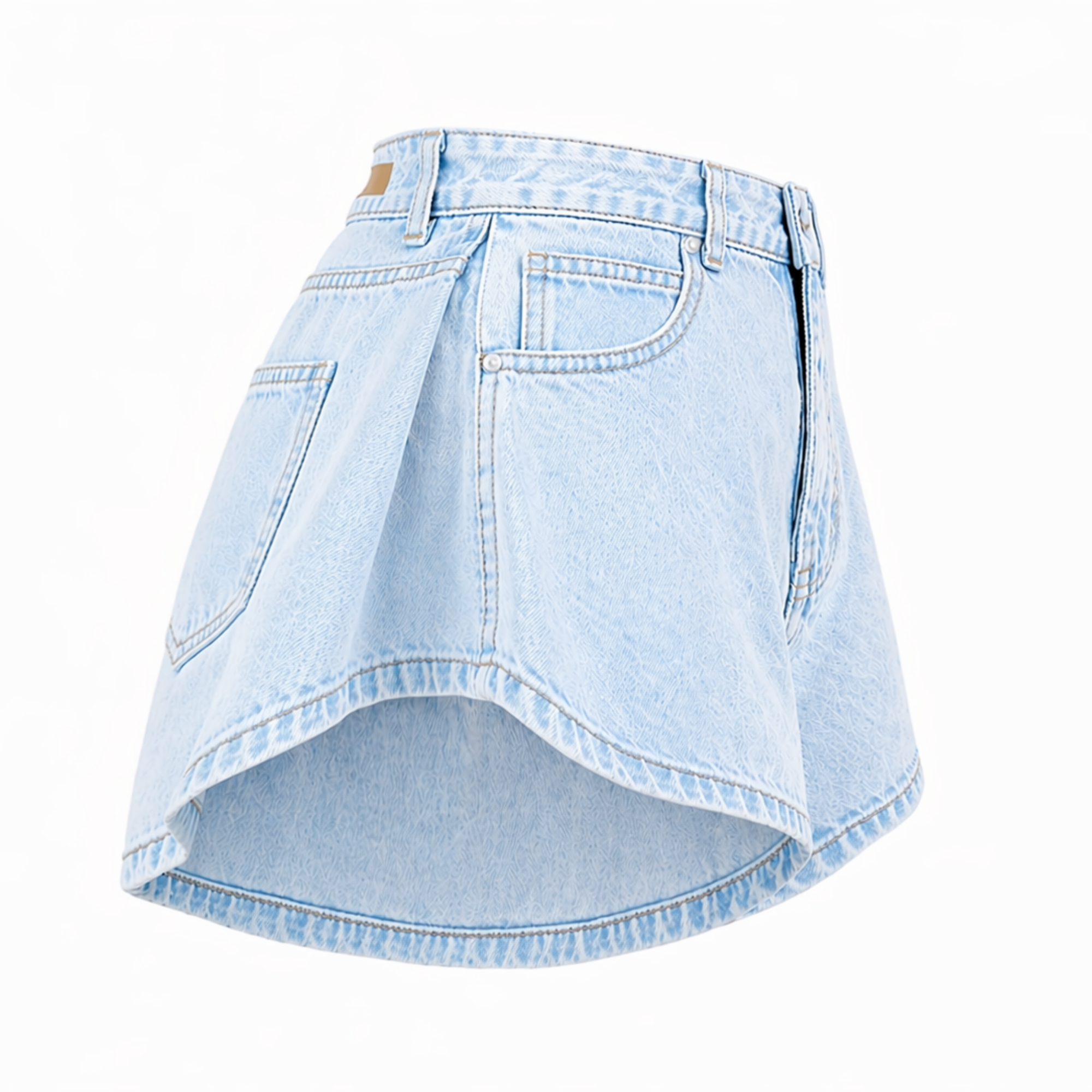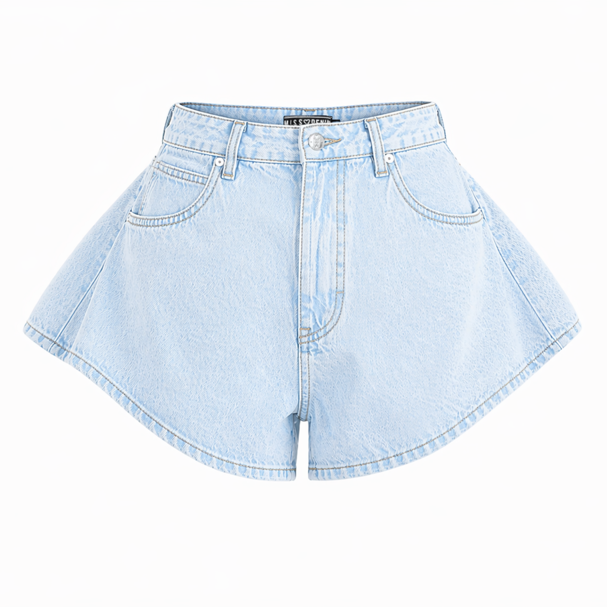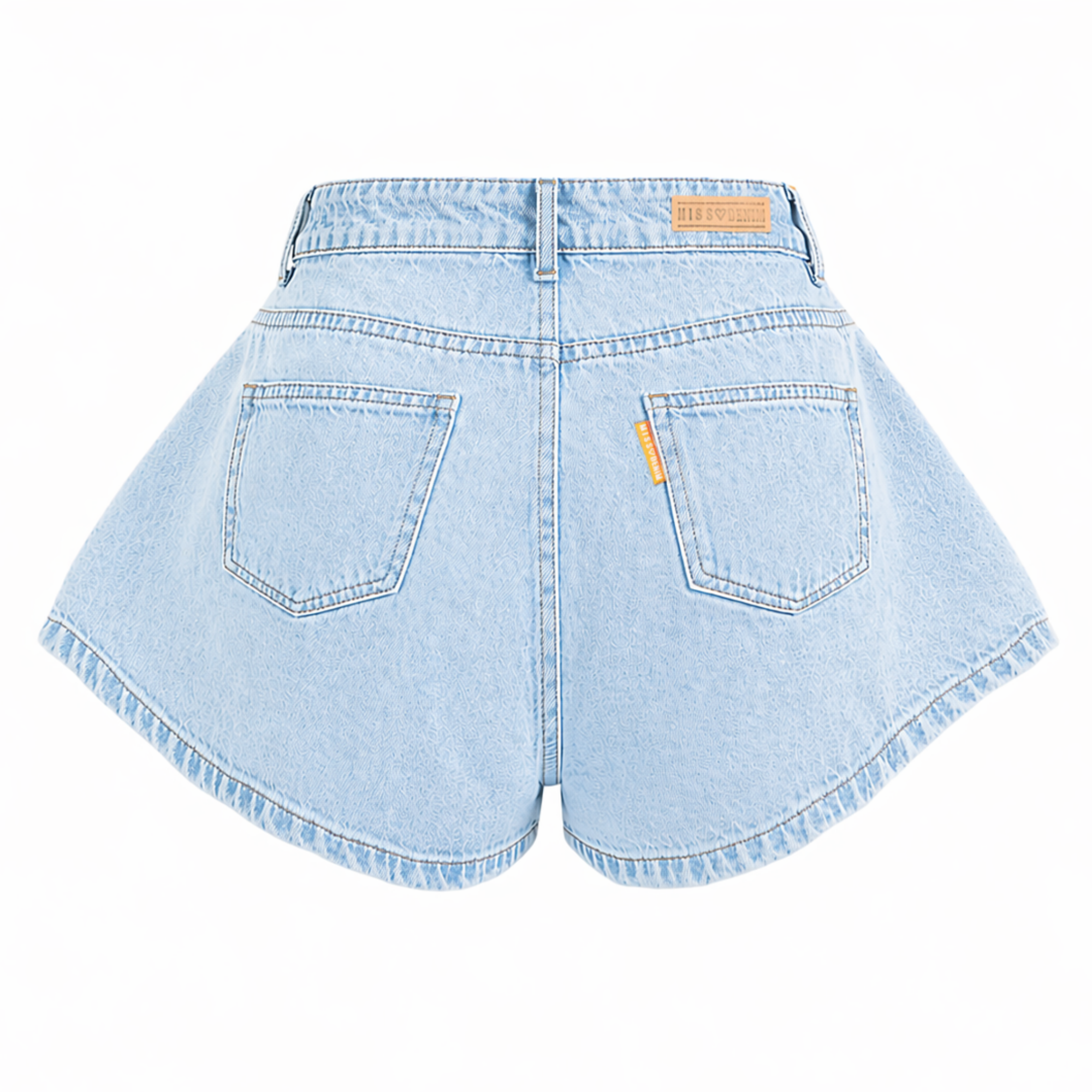 Niebieskie rozkloszowane szorty jeansowe o fasonie spódniczki z lampasem. Z wysokim stanem i rozszerzanymi nogawkami. Wersja z podszytymi nogawkami! NOWOŚĆ!