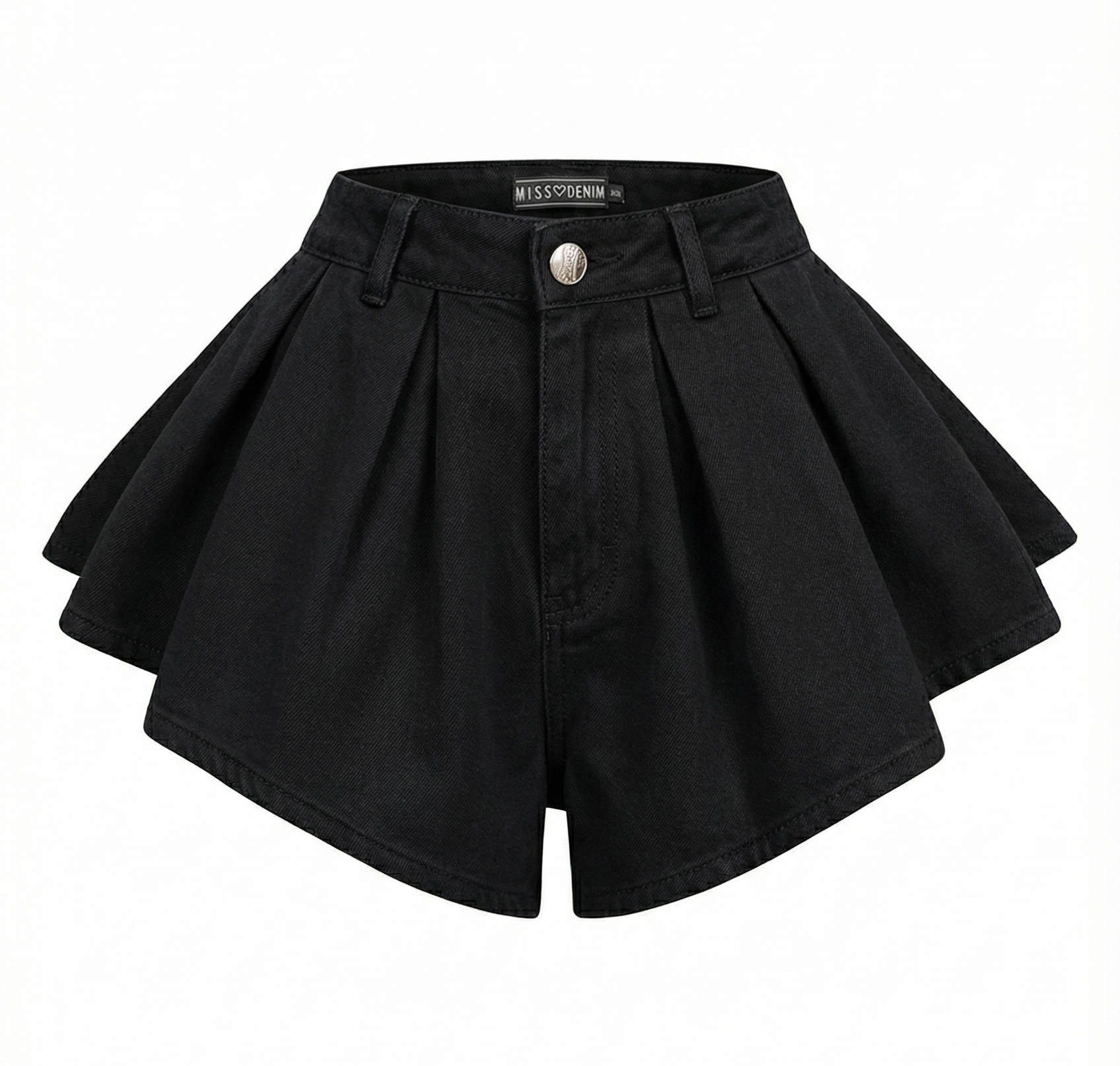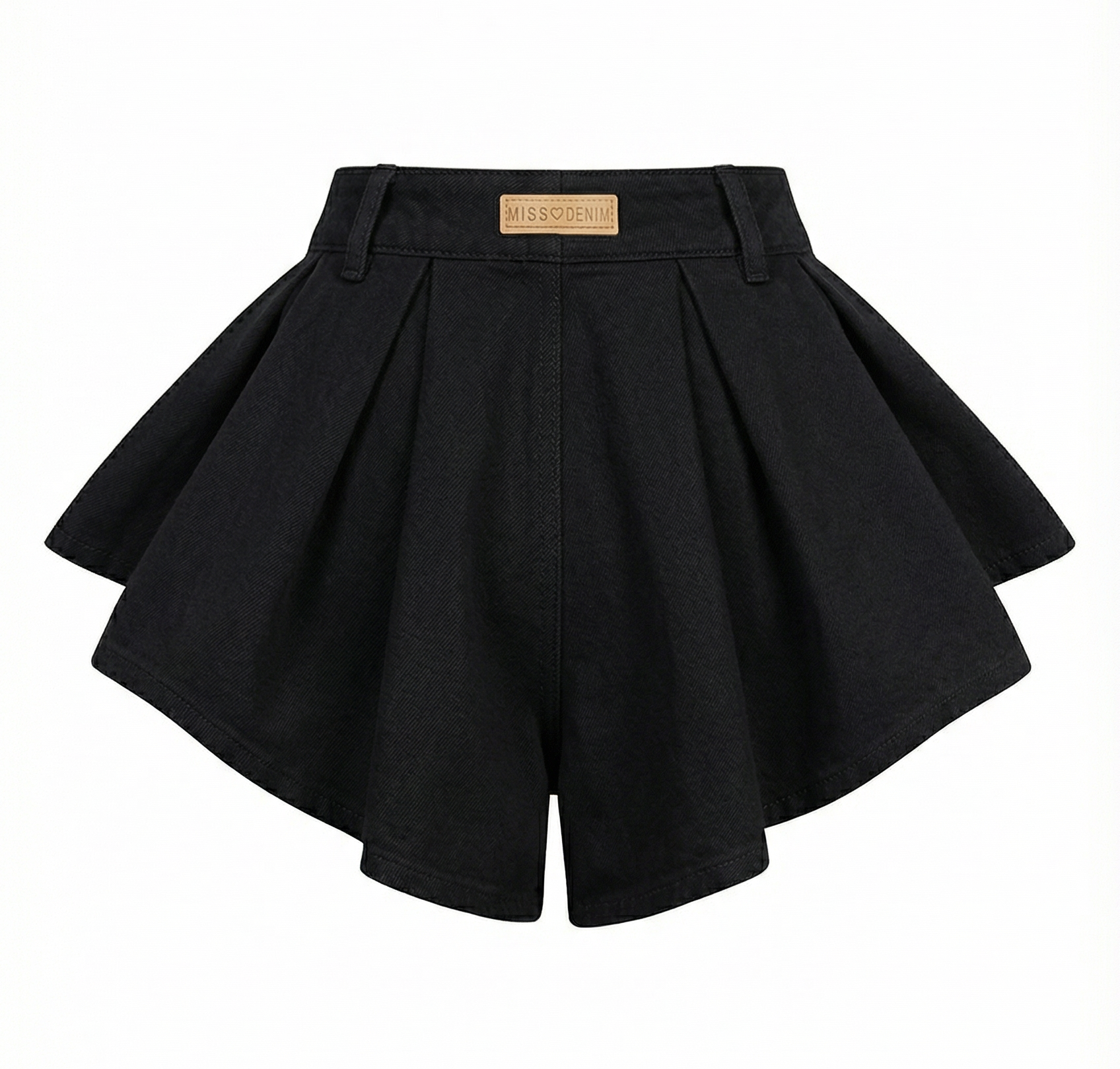 Czarne, rozkloszowane szorty jeansowe o fasonie przypominającym spódniczkę. Wykonane z wysokiej jakości denimu z wysokim stanem, który pięknie podkreśla talię. Z przodu i z tyłu eleganckie plisowane zakładki (kontrafałdy), nadające sylwetce lekkości i dziewczęcego uroku. Z tyłu czarna naszywka z tłoczonym logo MissDenim dodaje charakteru, a całości dopełniają logowane guziki i nity, które podkreślają dbałość o detale.