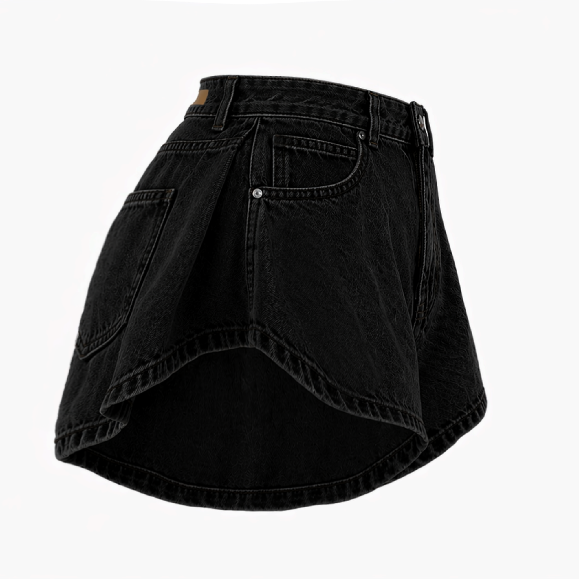 Czarne rozkloszowane szorty jeansowe o fasonie spódniczki z lampasem. Z wysokim stanem i rozszerzanymi nogawkami. Wersja z podszytymi nogawkami! NOWOŚĆ!