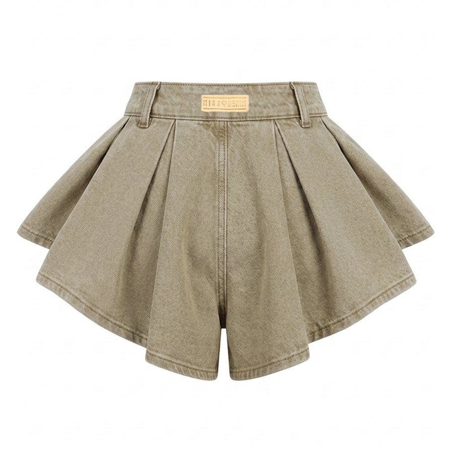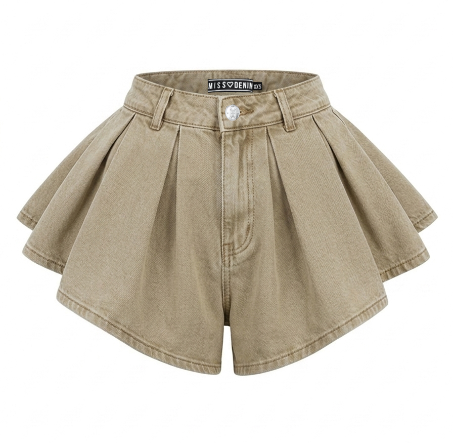 Beżowe, rozkloszowane szorty jeansowe o fasonie przypominającym spódniczkę. Wykonane z wysokiej jakości denimu z wysokim stanem, który pięknie podkreśla talię. Kolor surowego, nieopranego denimu. Z przodu i z tyłu eleganckie plisowane zakładki (kontrafałdy), nadające sylwetce lekkości i dziewczęcego uroku. Z tyłu czarna naszywka z tłoczonym logo MissDenim dodaje charakteru, a całości dopełniają logowane guziki i nity, które podkreślają dbałość o detale.