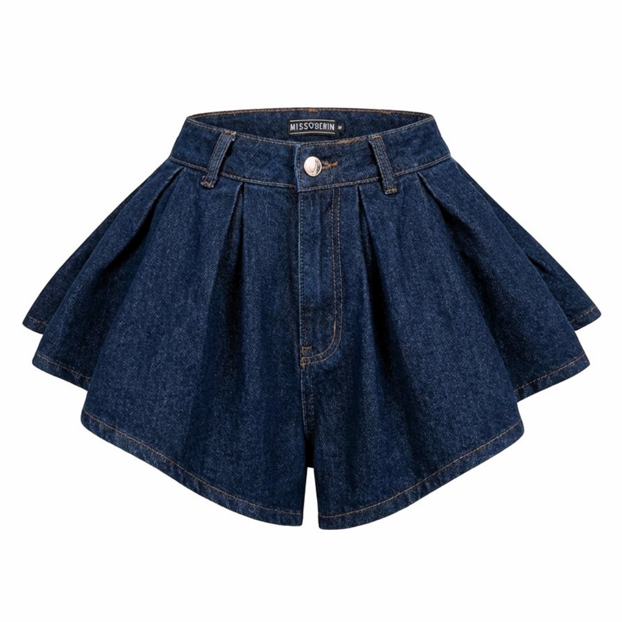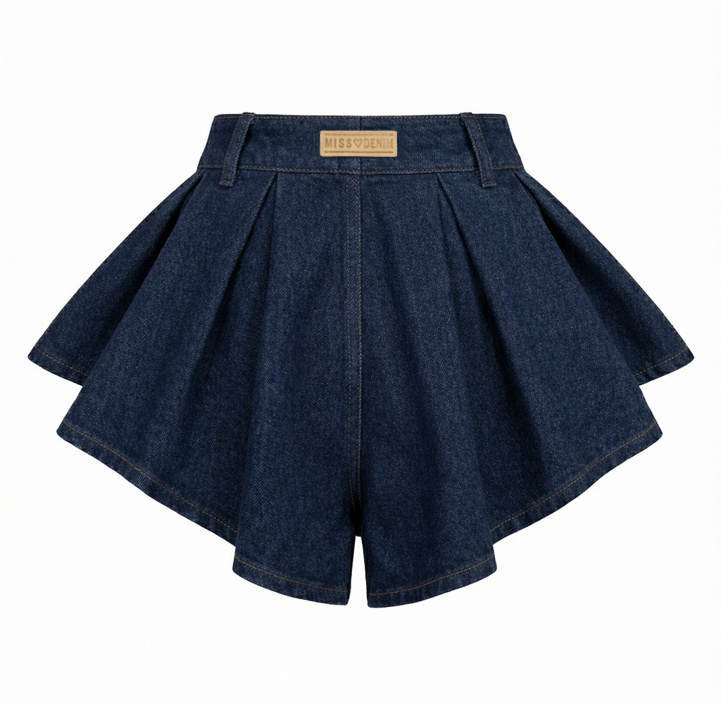 Niebieskie, rozkloszowane szorty jeansowe o fasonie przypominającym spódniczkę. Wykonane z wysokiej jakości denimu z wysokim stanem, który pięknie podkreśla talię. Kolor surowego, nieopranego denimu. Z przodu i z tyłu eleganckie plisowane zakładki (kontrafałdy), nadające sylwetce lekkości i dziewczęcego uroku. Z tyłu czarna naszywka z tłoczonym logo MissDenim dodaje charakteru, a całości dopełniają logowane guziki i nity, które podkreślają dbałość o detale.